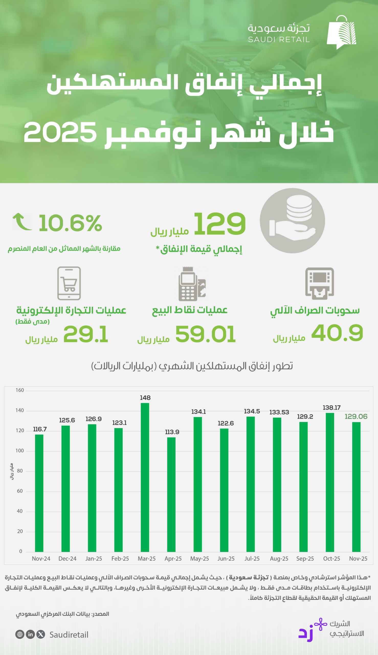 أظهرت أحدث البيانات الصادرة عن البنك المركزي السعودي “ساما” نمواً ملحوظاً في إجمالي إنفاق المستهلكين في المملكة العربية السعودية خلال شهر نوفمبر 2025، حيث بلغ إجمالي الإنفاق نحو 129 مليار ريال، مسجلاً زيادة قدرها 10.6% مقارنة بالشهر المماثل من العام الماضي.
